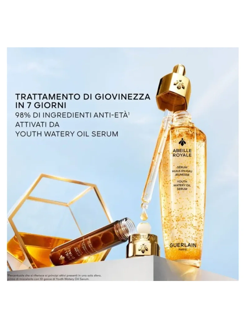 Spesso messa a dura prova, la pelle è soggetta a periodi di affaticamento o stress intenso durante i quali ha particolarmente bisogno di essere riparata. Bee Lab Shot, trattamento di 7 giorni con sfere cristallizzate composto al 98% da ingredienti anti-età¹, si fonde con Youth Watery Oil Serum per riparare visibilmente la pelle e correggere i segni dell’età fin dall’applicazione della prima dose: la pelle è visibilmente più riposata e luminosa, le rughe sono riempite. Dopo 7 giorni, la pelle è visibilmente trasformata e le rughe profonde sono attenuate. ¹Percentuale relativa ai principi attivi presenti nella sola sfera, prima che sia mescolata con 10 gocce di Youth Watery Oil Serum.