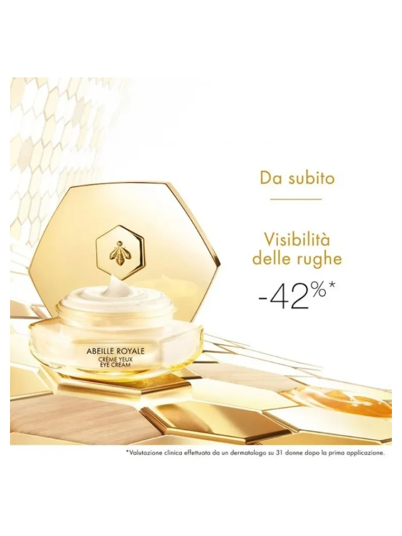 La Crema Occhi Abeille Royale agisce sulle molteplici rughe del contorno occhi, dalle linee sottili in superficie, alle rughe del leone e alle zampe di gallina, per uno sguardo visibilmente ringiovanito giorno dopo giorno. Attenua occhiaie e borse. Il contorno occhi è levigato e più luminoso. Soffice e al contempo avvolgente, la sua texture è unica. Ricca al tatto, si fonde con la pelle agevolandone l’applicazione. Una volta applicata, si fissa e avvolge la pelle del contorno occhi, consentendo la diffusione dei principi attivi. La pelle appare più liscia. Questa crema occhi è composta al 94% da ingredienti di origine naturale*. *Conformemente alla normativa ISO 16128, parti 1 e 2, il calcolo comprende l’acqua. Il restante 6% contribuisce a ottimizzare il piacere sensoriale e l’integrità della formula nel tempo.