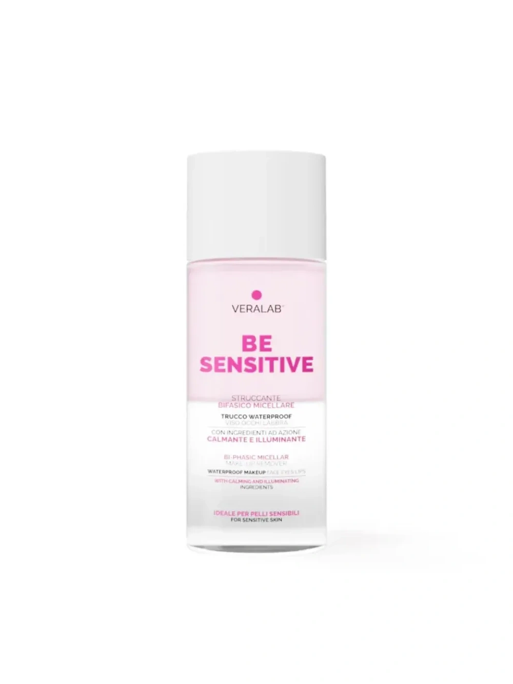 VeraLab Be Sensitive è uno struccante bifasico micellare che combina alla perfezione delicatezza ed efficacia, rimuovendo anche il trucco a lunga durata e waterproof da occhi, viso e labbra senza lasciare residui oleosi. Be Sensitive è oftalmologicamente testato: è perfetto per occhi sensibili o che tendono ad irritarsi, o per chi porta lenti a contatto.