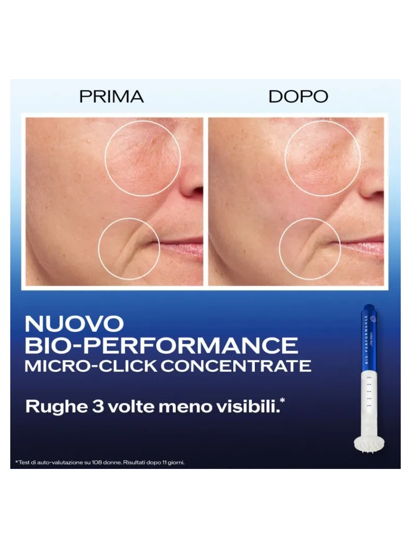 INNOVAZIONE SHISEIDO ISPIRATA ALLE PROCEDURE DI MEDICINA ESTETICA(1) Bio-Performance Micro-Click Concentrate, soluzione cosmetica avanzata anti-age di Shiseido, si rivolge a necessità specifiche della pelle come rilassamento cutaneo, rughe e pori dilatati, grazie a un innovativo applicatore ispirato alle procedure di medicina estetica (1) contro gli inestetismi della pelle. INNOVAZIONE CON NIACINAMIDE La tecnologia Precisedelivery TechnologyTM si avvale di un innovativo applicatore con 18 micro-punte che permette una doppia azione: • Erogare in modo preciso e controllato Niacinamide alla profondità ottimale (4) della pelle per massimizzarne l’efficacia • Attivare una stimolazione meccanica che favorisce la rigenerazione della pelle. Questa doppia azione leviga, distende il viso e minimizza i pori. (1) Non costituisce trattamento di medicina estetica. Trattamento cosmetico, ad effetti estetici. (4) A 20 micron nello strato superiore dell’epidermide.
