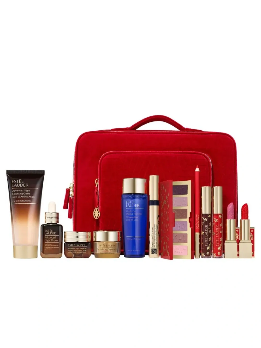 In questo set troverai: Advanced Night Repair Synchronized Multi-Recovery Complex Sfrutta il potere riparatore della notte. Questo siero per il viso a penetrazione profonda e rapida, con il nostro esclusivo Tripeptide-32 brevettato, unico su 60 milioni, potenzia 7 azioni riparatrici chiave. Riduce l’aspetto dei molteplici segni dell’invecchiamento. La pelle appare più liscia e meno segnata, più giovane, più sana, più luminosa, più uniforme e tonica. Revitalizing Supreme+ Youth Power Creme Moisturizer Il potere dell’UPLIFT in una crema, ora è tuo. Per una pelle più liftata, rassodata e nutrita. Con l’esclusivo estratto di Moringa e il fiore di Ibisco colto al mattino, al 99% di origine naturale, darai alla tua pelle la possibilità di rivelare tutto il suo potenziale. Advanced Night Repair Eye Supercharged Gel-Creme Synchronized Multi-Recovery Eye Cream Inizia da stanotte, ricarica il tuo contorno occhi per un look più luminoso, disteso e pieno di vitalità. Schiarisce le occhiaie in sole 2 settimane. Le linee e l’aspetto dei primi segni del tempo appaiono ridotti. Gentle Eye Makeup Remover Questa formula non aggressiva rimuove ogni traccia di ombretto in polvere e altro trucco dagli occhi con delicatezza e velocemente. Elimina il trucco senza lasciare alcun residuo oleoso-per consentirne l’immediata riapplicazione dopo la pulizia. Formula priva di olii, non danneggia la pelle delicata. Sumptuous Extreme Mascara volumizzante, infoltente Le ciglia sembrano moltiplicarsi, infoltirsi, allungarsi all’estremo. Sumptuous Extreme crea un volume che va oltre ogni standard, solleva e incurva le ciglia per conferire un audace effetto ciglia finte. Lo sguardo diventa più luminoso, più ampio e più seducente. Advanced Night Cleansing Gelée Cleanser with 15 Amino Acids Dai nostri esperti della skincare notturna nasce un’elevata esperienza di detersione, creata per dare il via al tuo rituale di bellezza. Detergente delicato: questo gel rigenerante si trasforma in una schiuma soffice e vaporosa che deterge delicatamente ma in profondità la tua pelle. Limited Edition Eyeshadow Palette in CELESTIAL GLAM formato deluxe Include 6 tonalità per gli occhi (da sinistra a destra): Pink Dusk (Matte), Aubergine Aura (Matte), Twinkling Lilac (Frost), Amethyst Cosmos (Matte), Full Moon (Matte) and Smoky Embers (Matte). Limited Edition Lipstick 2 rossetti in edizione limitata full size in Starlet Red (un rosso vibrante dal sottotono caldo e dal finish cremoso) e Saturn Reign (un rosa blu con sottotono freddo e finitura cremosa). Limited Edition Lip Gloss 2 Limited Edition Lip Glosses in edizione limitata in formato speciale nei colori Divine Plum (un vino intenso con finitura creme shine) e Ruby Quartz (un rosso ricco con finitura creme shine). Double Wear 24H Stay-in-Place Lip Liner 07 Red Modella. Definisce. Colore impeccabile. Questa matita labbra, infusa di oli trattanti, dona un colore intenso, a lunga tenuta e coprente, con una stesura morbida e fluida. No transfer, dura fino a 24 ore. Il colore puro e potente non macchia e non sbiadisce, resistendo alle sbavature. La formula con l’olio di Jojoba idrata le labbra all’istante e nel tempo. Il professionale pennello labbra integrato assicura un’applicazione impeccabile. Utilizzalo per distribuire e sfumare il prodotto e per applicare con maestria il rossetto. Chiudi bene il tappo dopo ogni utilizzo.