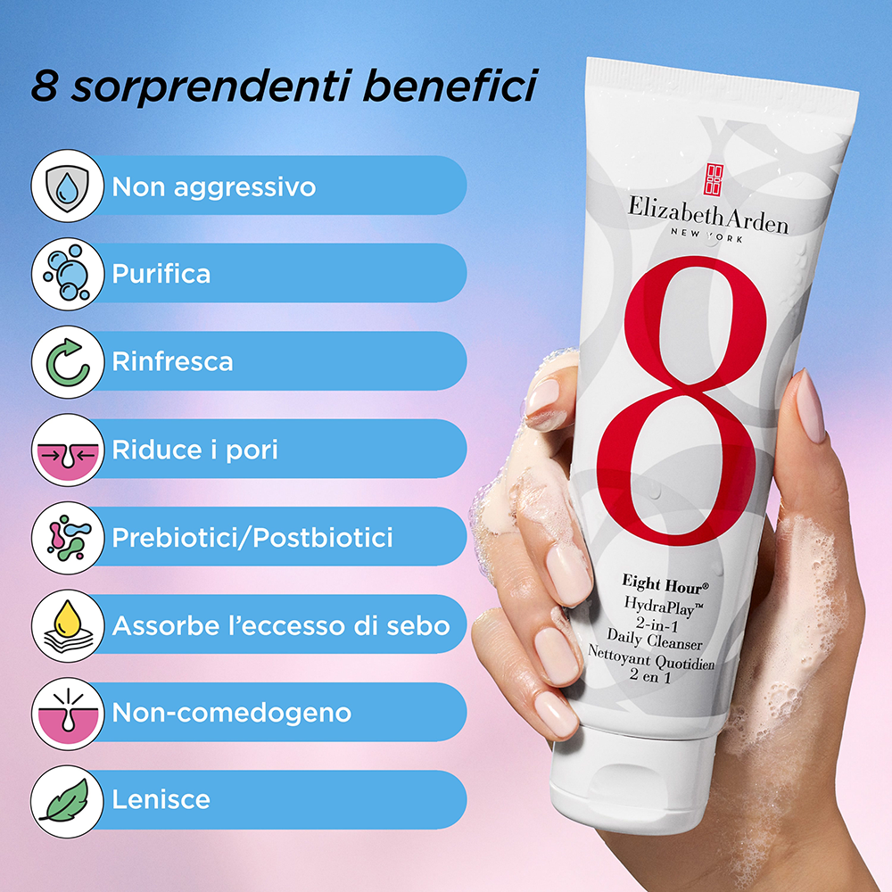 Gel detergente e maschera 2 in 1 che pulisce la pelle in profondità senza comprometterne la naturale idratazione. Rimuove le impurità e il trucco, mentre se come maschera pulisce i pori e lascia la pelle fresca, morbida e idratata. Adatto a tutti i tipi di pelle, comprese quelle grasse e sensibili.EIGHTHOUR HYDRAPLAY mousse e maschera detergente quotidiana 2 in 1 125 ml