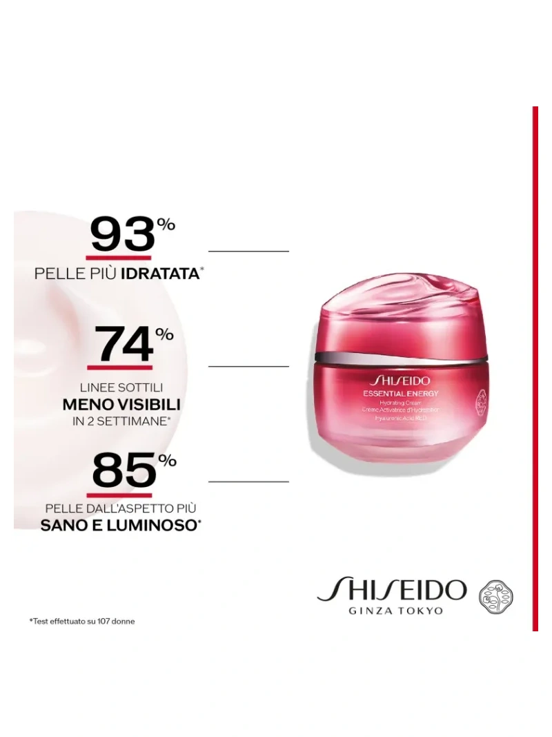 Questa crema idratante morbida e leggera si assorbe rapidamente e dona un`idratazione costante e un aspetto luminoso al viso. Attiva la capacità della tua pelle di generare un`idratazione profonda e di prevenire le linee sottili con l`esclusivo acido ialuronico RED di SHISEIDO per un`idratazione ancora più profonda e 3 volte più duratura*. Formulato con Ginseng RED per linee sottili meno visibili in 2 settimane** Offre un`idratazione costante ed essenziale per rivelare una pelle piena di energia e un aspetto sano e radioso. Risultati: -Alla prima applicazione, per il 93%** la pelle risulta idratata -In 1 settimana, per l`85%** la pelle risulta morbida ed elastica -In 2 settimane, per il 74%* *le linee sottili risultano meno visibili -In 4 settimane, per l`86%** la pelle ha un aspetto sano e radioso *La nuova ESSENTIAL ENERGY Hydrating Cream ha un effetto idratante 3 volte maggiore rispetto alla ESSENTIAL ENERGY Moisturizing Cream esistente (24H contro 8H). Test clinico con 22 donne. **Test del consumatore con 107 donne Fragranza floreale fresca ed energetica. Ricarica disponibile. NON COMEDOGENICO. TESTATO DERMATOLOGICAMENTE.