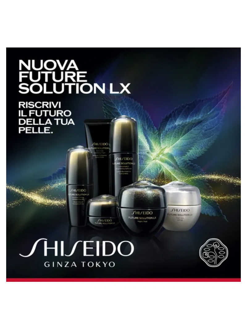 NUOVA SHISEIDO FUTURE SOLUTION LX EXTRA RICH CLEANSING FOAM Il risultato di oltre 40 anni di impegno nella ricerca genetica. RISCRIVI IL FUTURO DELLA TUA PELLE RIVELA UNA PELLE RADIOSA E RESILIENTE A COSA SERVE Prova l’efficacia di questo detergente all’avanguardia che purifica e deterge la pelle in profondità preservandone al contempo l’idratazione. Arricchito con esclusivi ingredienti botanici giapponesi, la sua texture ricca e corposa si trasforma in una schiuma impalpabile, offrendo una sensazione confortevole alla pelle. I BENEFICI Rimuove il sebo in eccesso e preserva l’idratazione ottimale della pelle, lasciandola morbida e purificata. Prepara la pelle a ricevere i benefici dei trattamenti skincare successivi. In 3 giorni, l’89% delle donne percepisce una riduzione del sebo della pelle.* *Test di consumo su 111 donne COME AGISCE – La formula di Extra Rich Cleansing Foam trattiene gli ingredienti idratanti nella pelle, aderendo alla superficie cutanea e distribuendosi dopo il risciacquo per creare un sottile velo protettivo di idratazione. – Potenziata dagli esclusivi ingredienti botanici giapponesi esclusivi Shiseido: Estratto di Enmei Herb ed Estratto di Fiore di Ciliegio per ottimizzare la resilienza e la radiosità della pelle