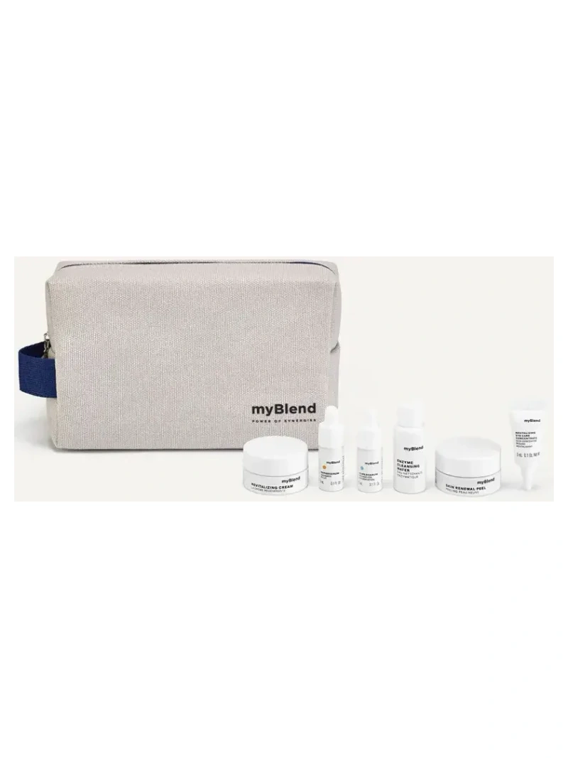 I 6 essenziali myBlend in formato viaggio per una beauty routine che idrata in profondità la pelle e ne aumenta la luminosità. Il tutto in un astuccio in cotone riciclato per accompagnarti ovunque tu vada. Il rituale ideale per scoprire le texture e gli effetti dei prodotti curativi myBlend , altamente concentrati in principi attivi, per un periodo di 6 giorni. In questa confezione: Acqua Enzimatica – 10 ml, Peeling Nuova Pelle – 10 ml, Supersérum Hydratation – 4 ml, Supersiero Radiante – 4 ml, soin Concentré Regard Revitalisant – 4 ml, Crema Rigenerante – 10 ml. Tipo di pelle : Tutti i tipi di pelle, anche quelle sensibili.
