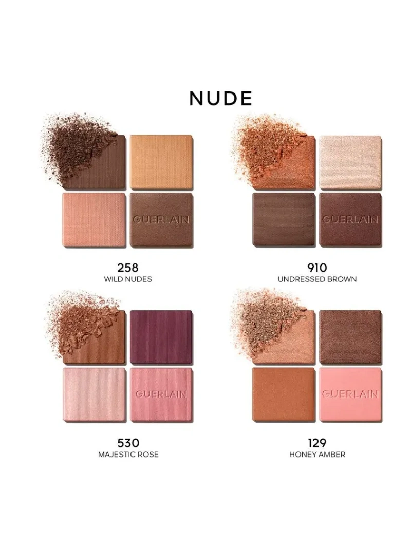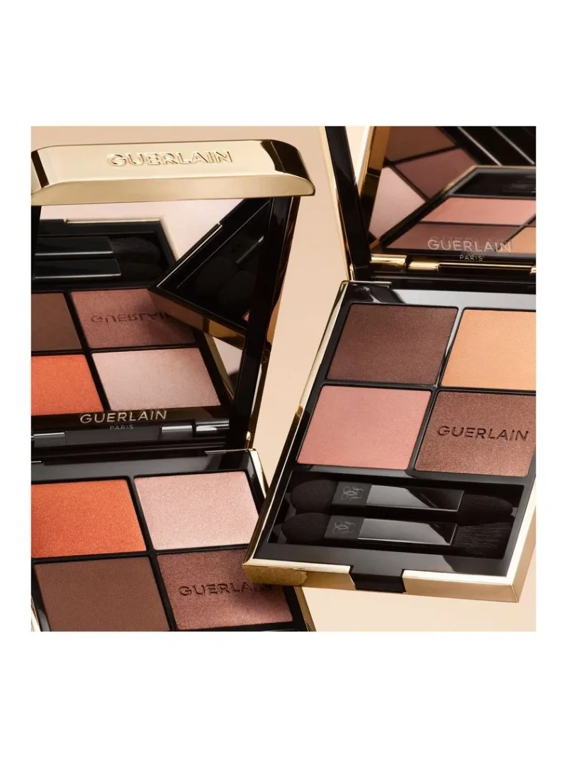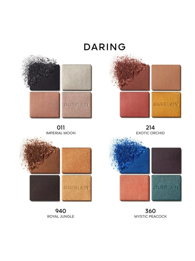 Le palette di ombretti Ombres G hanno una texture ultra sensuale, ad alta pigmentazione, per un colore a lunga tenuta con una profondità senza precedenti per un effetto potente. Le Ombres G adornano lo sguardo in quattro differenti finish: un satin intenso, un mat profondo, un finish metallico luminoso e un luminoso madreperla. Violette, Direttore Creativo Make-up di GUERLAIN, ha creato 6 palette di tonalità intense e stravaganti dall`eccellente resistenza, creato ispirandosi alle meraviglie della natura. Le armonie cromatiche 3 stelle per un look accattivante: 360 – Mystic Peacock: una combinazione di diverse sfumature di blu ispirate alle voluttuose sfumature delle piume di pavone, esaltate dai luccicanti toni del rame; 555 – Metal Butterfly: gli ipnotizzanti accenti metallici delle ali di farfalla nei toni dell`oro, rosa, arancio e marrone; 530 – Majestic Rose: tutte le sfaccettature di un delicato petalo di rosa interpretato nei toni irresistibilmente tenui del rosa, prugna e marrone. Tre quaderni di ombretti aggiuntivi completano questa tavolozza di colori unica: 011 – Imperial Moon: un sofisticato effetto fumoso che fonde il nero e l`argento Zen e scintillante come un raggio di luna, addolcito da un tenue tono nude; 214 – Exotic Orchid: sfumature dal rosso bordeaux all`oro – lo splendore e l`intensità dell`orchidea; 940 – Royal Jungle: toni marroni maestosi dal marrone intenso al bronzo scintillante. Ombre G viene fornito in un elegante cofanetto per gioielli. Una custodia dorata, sottilmente decorata con una doppia G. La Ombre G è avvolta in velluto nero. Ogni tavolozza è dotata di due applicatori per una facile applicazione: punte in schiuma per la massima copertura, una fodera per un disegno preciso e un pennello per sfumare le texture.