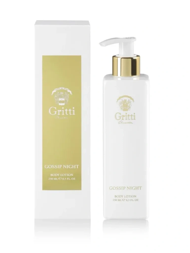 Gritti Venetia Gossip Night Body Lotion 250 ml. Tipo: Lozione (sostanza), Adatto per: Donna, Effetto Cura della pelle: Idratante, Nutriente, SetificanteGritti Venetia presenta la nuova aggiunta alla White Collection: i best-seller Adèle, Chantilly e Gossip Night nei formati di bagno schiuma, crema corpo e candela.Concedetevi un rituale di bellezza dal profumo seducente e irresistibile, scegliendo tra la delicatezza dell`osmanto (Adèle), la cremosità della pesca (Gossip Night) o la dolcezza della vaniglia di Madagascar (Chantilly).Dal primo tocco del bagno doccia sulla pelle, passando per la leggerezza della crema e fino alla danza della fiamma della candela, i profumi più amati di Gritti Venetia sono pronti ad accompagnarvi per tutta la giornata.Gossip Night Body Lotion 250 mlCaratteristicheTipo: Lozione (sostanza)Adatto per: DonnaEffetto Cura della pelle: Idratante, Nutriente, SetificanteAdatto per i tipi di pelle: Pelle universaleVolume: 250 mlTipo di dispenser: Flacone a pompaProfumata: SìProfumo: Pesca