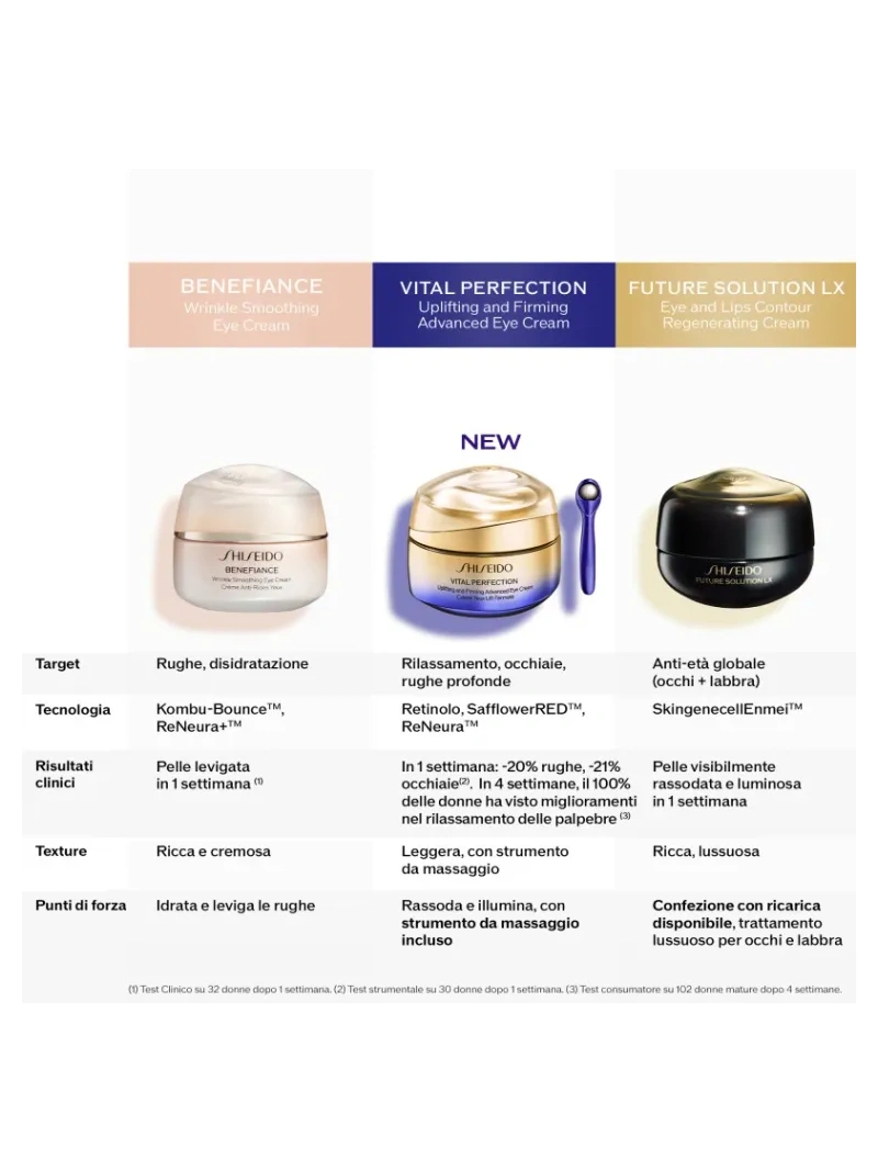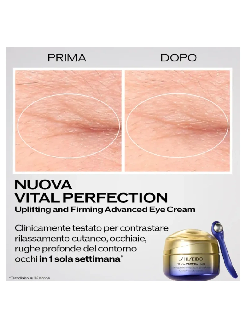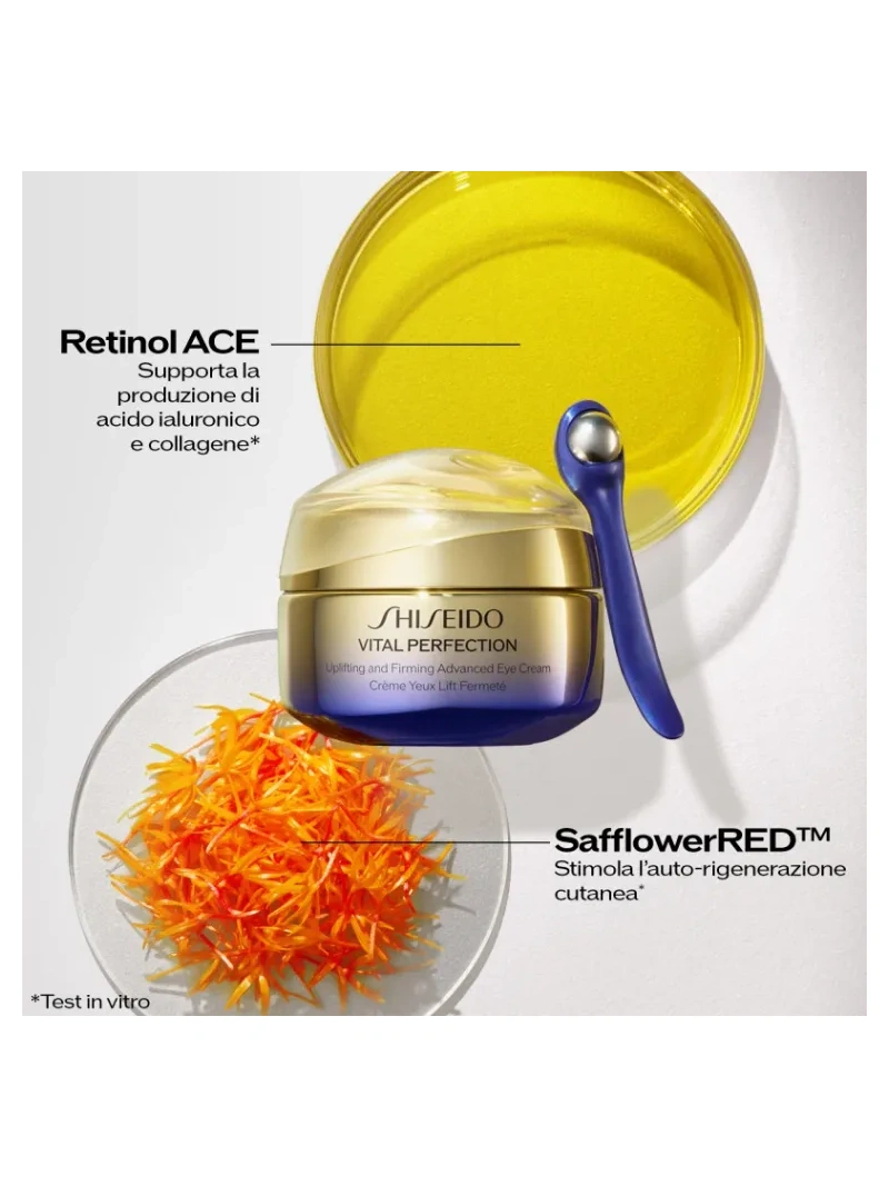 La crema occhi bestseller di Shiseido, grazie al retinolo, contrasta efficacemente i segni dell`età del contorno occhi: occhiaie, rughe profonde e rilassamento cutaneo. In una sola settimana(1), riduce visibilmente rilassamento cutaneo, occhiaie e rughe profonde, per un aspetto visibilmente liftato, rassodato e illuminato. La formula è stata potenziata con l`iconico SafflowerRED, rendendola tre volte più efficace contro le rughe del contorno occhi rispetto al solo retinolo(2). Il prodotto è dotato di un esclusivo strumento da massaggio la cui efficacia nel`amplificare l`effetto della crema su vari segni dell`invecchiamento è clinicamente dimostrata, per offrire un`esperienza anti-età completa. Risultati clinicamente dimostrati che migliorano nel tempo: – Immediatamente: il contorno occhi appare rassodato e più luminoso per il 96% delle donne. (3) – Dopo una settimana: occhiaie e rughe risultano visibilmente ridotte per l`87% delle donne. (3) – Dopo quattro settimane: il rilassamento delle palpebre mostra un miglioramento visibile per il 100% delle donne (3).Prodotto dermatologicamente testato e non comedogeno. VITAL PERFECTION: LA LINEA N.1 DI SHISEIDO EFFETTO LIFTING E RASSODANTE – Sfruttando la skincare expertise di Shiseido, la linea Vital Perfection contrasta efficacemente macchie scure e rughe profonde. – Clinicamente testato per liftare, rassodare e illuminare la pelle. ROUTINE PER UNA PELLE RASSODATA E LUMINOSA: 1. Vital Perfection Liftdefine Radiance Serum per scolpire e ridefinire l`ovale del viso2. Uplifting and Firming Advanced Cream per rassodare, liftare e illuminare la pelle3. Uplifting and Firming Advanced Eye Cream per contrastare le rughe profonde e il rilassamento cutaneo del contorno occhi. (1) Test clinico su 32 donne. (2) In 1 settimana su zampe di galline e rughe sotto gli occhi. Test clinico su 40 donne. (3) Test consumatore su 102 donne.