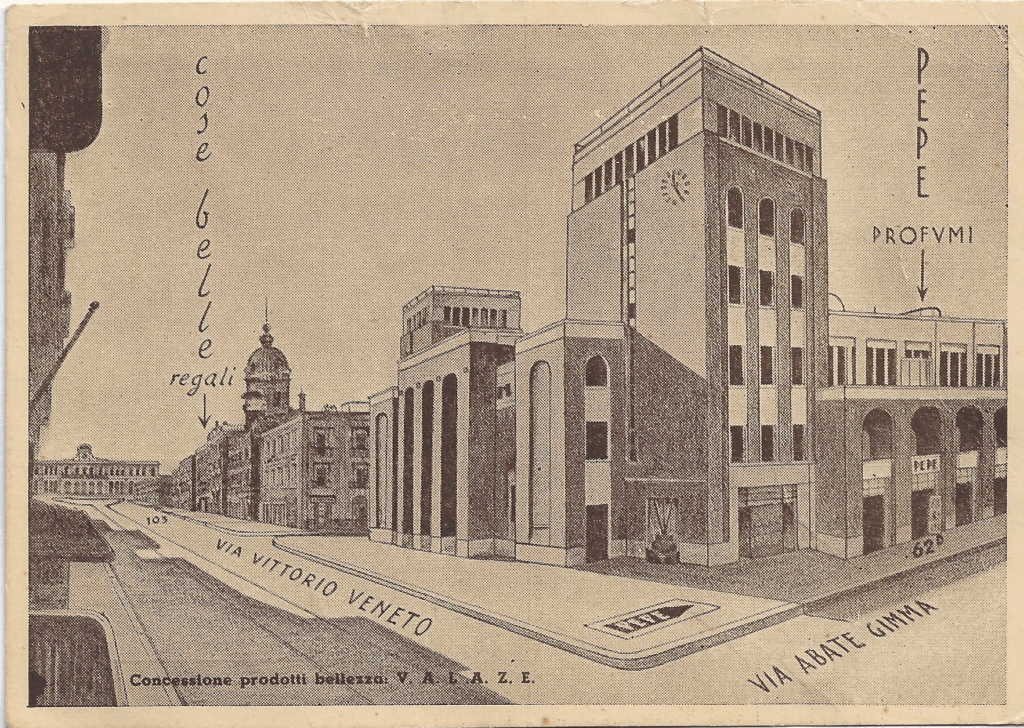 Nel 1933 si trasferì nell’attuale sede di via Abate Gimma, in un locale più prestigioso nell’appena realizzato palazzo San Ferdinando e prese il nome di “Profumeria Pepe”. Questo trasferimento dava ancora maggiore concretezza al successo dell’esercizio commerciale di Lorenzo Pepe che già da allora offriva alla sua clientela il meglio della profumeria italiana ma anche di quella estera, a dispetto del crescente spirito autarchico del regime.